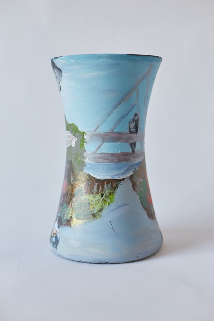 Emulsion paint and paper on hand tied glass vase 20cm x 11cm 2021
