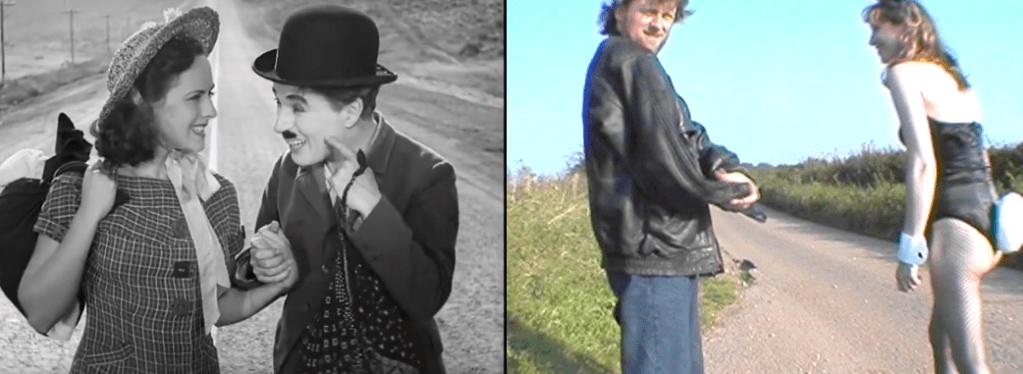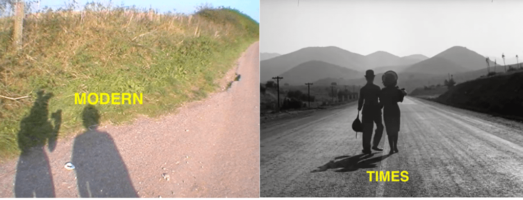 Inspired by the final shot of Modern Times Charles Chaplin in which the gamine girl and the tramp walk away from the camera.