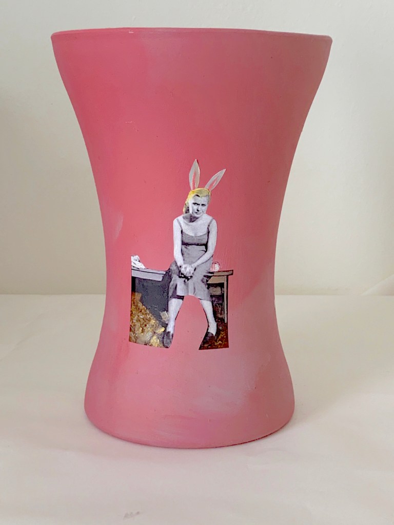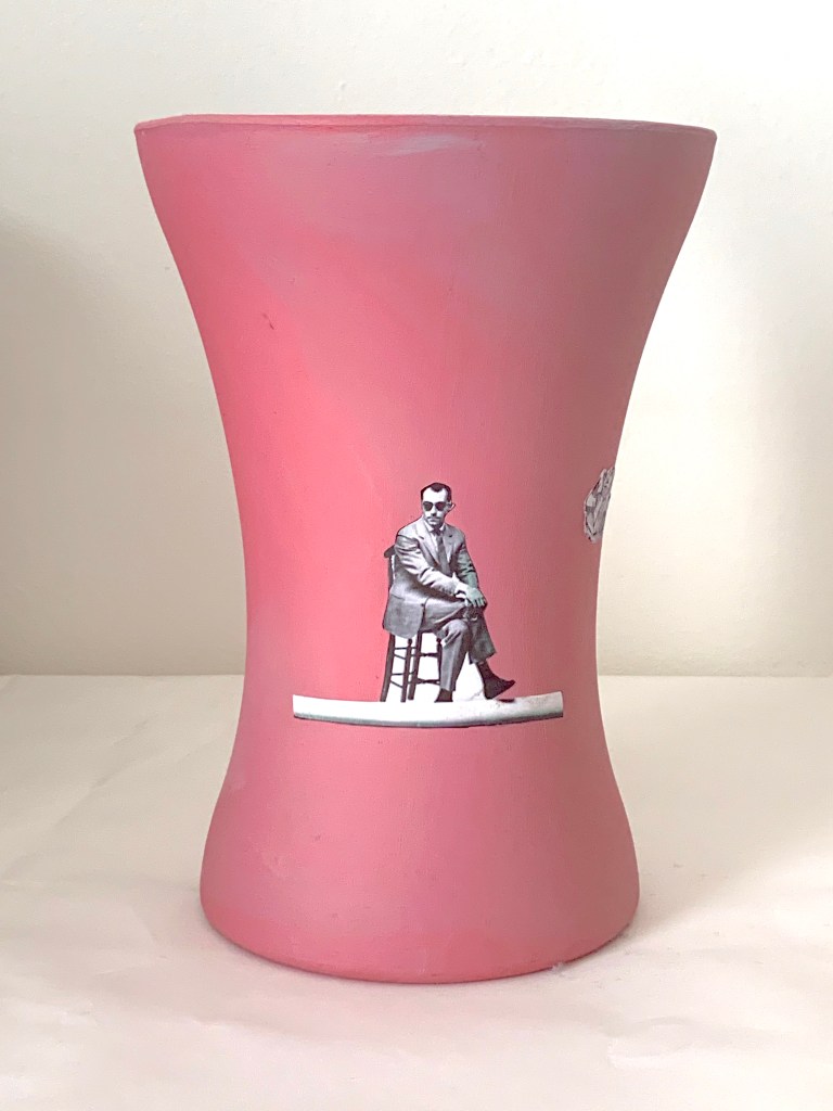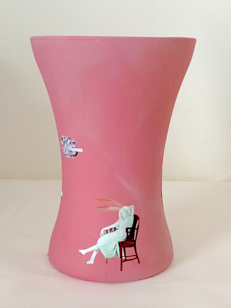 carmine emulsion and paper on handtied acryic vase 20 x 14 cm