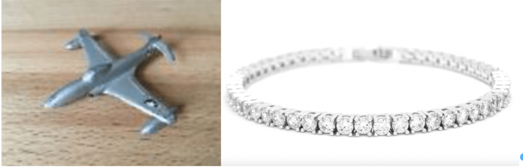 Felt on glass with tennis bracelet and collectable vintage dinky toy diecast Shooting Star Fighter Plane