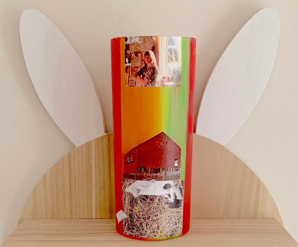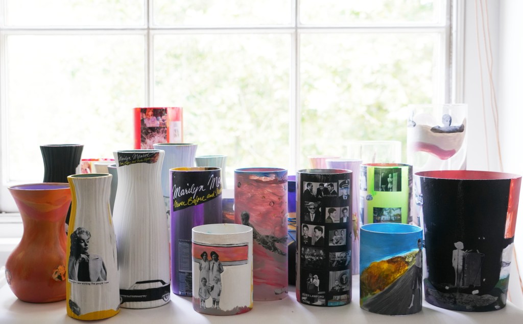 I began painting vases during lockdown 2020 beginning with importing anticeramic vases from China and using acrylic, emulsion and photocopies. The collective noun for Vases is a mingling.